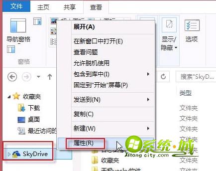 首先按“Win+E”快捷键或者直接点击Win8.1系统开始屏幕上的“这台电脑”磁贴进入传统桌面,并打开文件管理器,我们就可以看到在左侧的栏目中已经有SkyDrive,鼠标右键点击SkyDrive图标上,从菜单中选择“属性”选项。