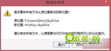 修改完毕之后点击“确认”,系统会询问用户是否将原来位置的文件转移到新的位置上,再次点击确认,所有文件都将会转移到新的存放目录下,而且默认的SkyDrive的保存位置也会改变。