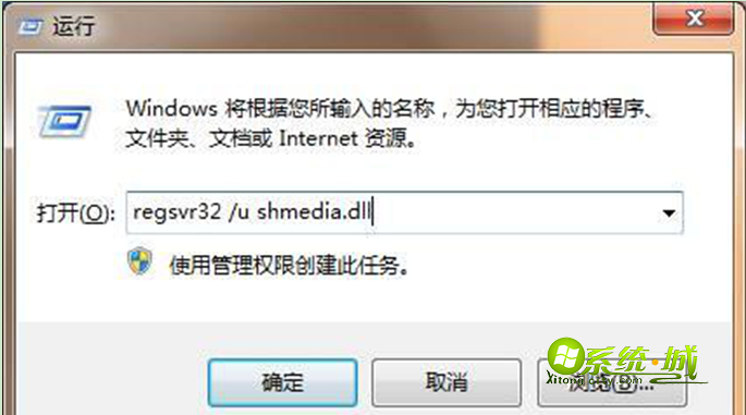 按“win+r”打开“运行”窗口,输入“regsvr32 /u shmedia.dll”命令后点击“确定”按钮,接着会弹出注册成功的提示,然后便可对xp视频文件预览功能进行删除了。