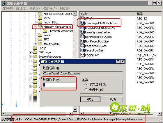 3、在弹出的“编辑DWORD”值对话框中,选择基数为十六进制,并将左边的“数值数据”改为1,这样就启用了关机时自动清理页面文件功能;
