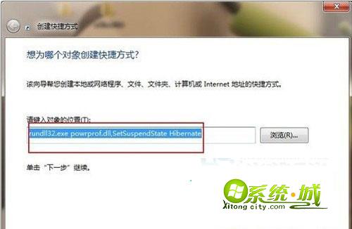 2、接着在提示的对象位置上,键入我们需要创建快捷方式程序的位置,将“rundll32.exe powrprof.dll,SetSuspendState Hibernate”输入到空格处,点击下一步。