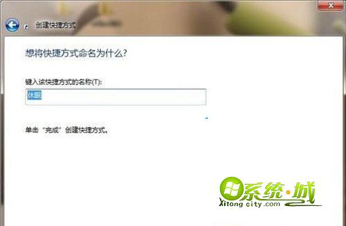 3、将我们新建的快捷方式设定一个名称,这里取名为“休眠”,点击完成按钮。就这样快捷方式就创建好了,现在我们只需要去双击运行“休眠”程序,计算机系统就会自动进入黑屏后休眠。