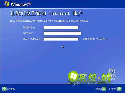 输入电信或联通提供的帐号和密码,在“你的ISP的服务名”处输入你喜欢的名称,该名称作为拨号连接快捷菜单的名称,如果留空系统会自动创建名为“我的ISP”作为该连接的名称,点击“下一步”按钮。