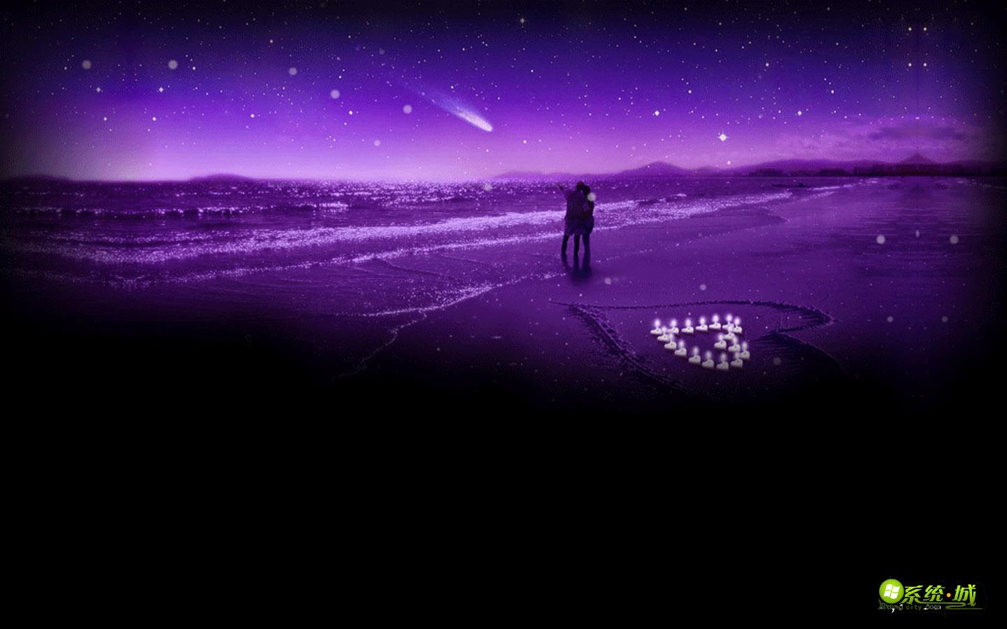 你喜欢紫色吗?紫色是代表神秘的颜色,小编为大家带来的这款紫色海滩爱恋xp桌面主题,将为大家带来一个紫色的世界。紫色的夜空,布满繁星,唯美而浪漫。紫色的海滩上,恋人紧紧相拥,一起看流星划过天空。在他们的身后,是用白色的蜡烛围成的大大爱心,是不是很浪漫呢?这样充满梦幻的夜晚,依偎在爱人怀中,一定感觉很幸福。快来下载这款主题吧。